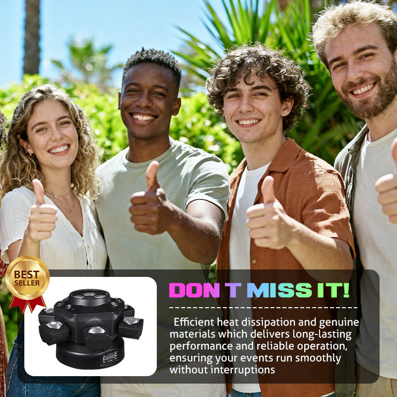 DYNAMISCH ZES-ARMIG ONTWERP - Beschikt over zes onafhankelijk beweegbare armen, elk met een krachtige lichtbundel. Dit creëert adembenemende, ruimtevullende effecten en energieke lightshows die elk publiek boeien en de sfeer van je evenement versterken.