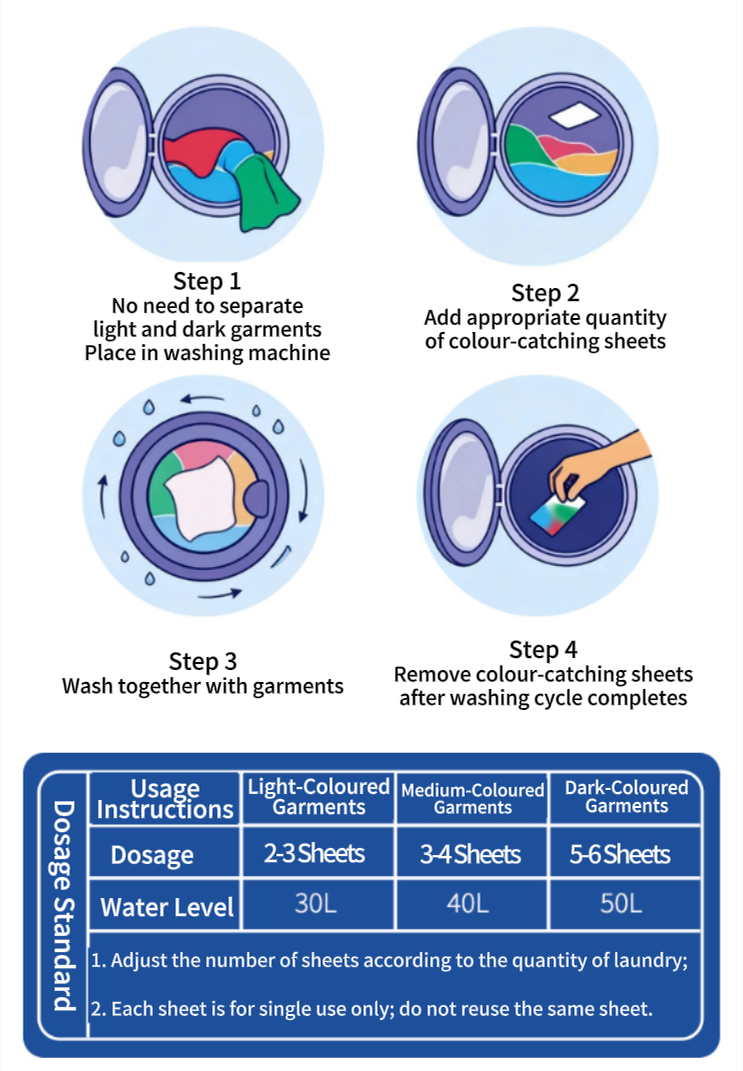 Gebruik 2-3 vellen voor grotere wassen of voor nieuwe, donkergekleurde kleding om een maximale effectiviteit te garanderen.