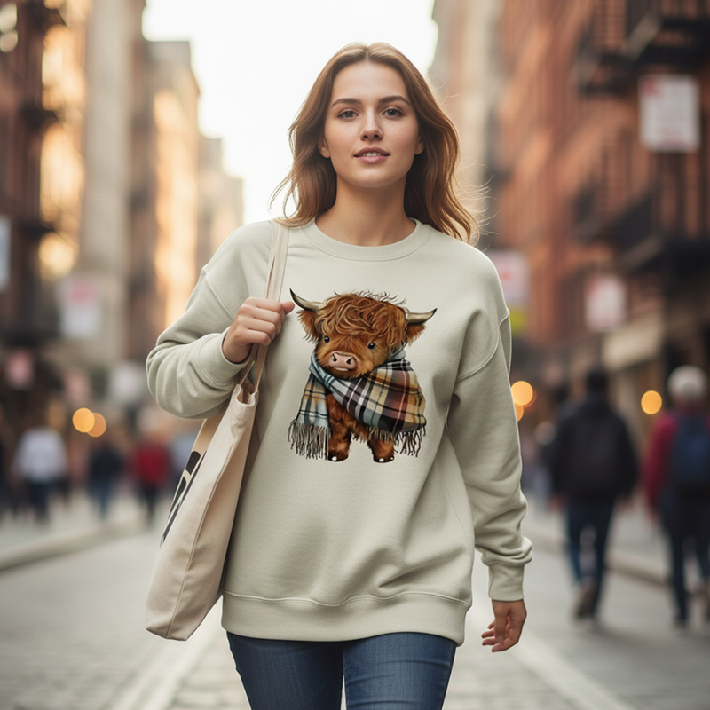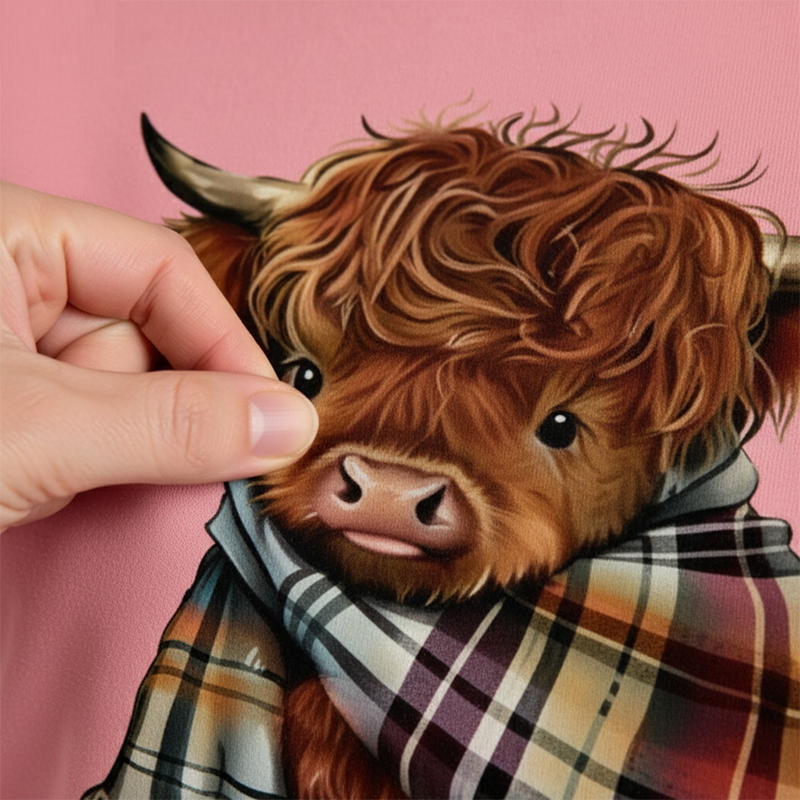SCHATTIGE HOOGLANDER AFBEELDING - Voorzien van een charmante Hooglandkoe met een geruite sjaal, wat een unieke en speelse touch aan uw garderobe toevoegt. Dit prachtige ontwerp zal zeker complimenten opleveren en uw dag opvrolijken.
