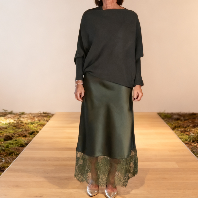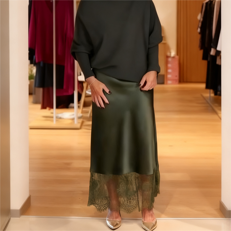 🌸 ELEGANTE ROK MET KANTAFWERKING – De glanzende rok is prachtig afgewerkt met een delicate kanten zoom, wat een vleugje romantiek en verfijnd detail toevoegt. Het vloeiende ontwerp benadrukt beweging en creëert een sierlijke, vrouwelijke look.